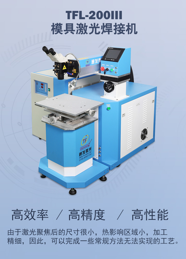 TFL-200Ⅲ型模具激光焊機是通發激光公司在TFL-180Ⅲ的基礎進行了改良,采用通發自主研發的二代精密單燈電源為燈泵浦驅動電源,配置觸摸屏,操作更方便。主機具備激光頭手搖升降與工作臺按鈕電動升降實現焊接不同厚度模具的激光焊加工。本款機型更適用于各類高精密注塑模具激光補焊,精密塑膠模具零件激光修補,塑膠模具鈹銅零件激光燒焊;可對模具使用過程中出現的磨損進行激光修復;對機械加工失誤、電火花加工失誤,模具減膠設計變更等需要對模具修改,起到關鍵的作用,可彌補因加工失誤造成的巨大損失。